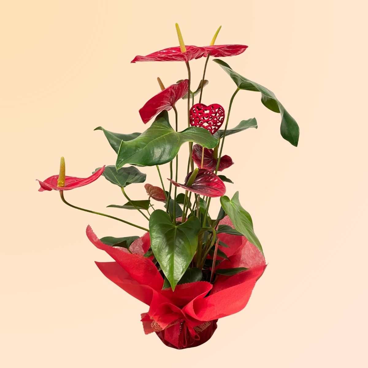 Para este San Valentín, presentamos nuestro Anturio con un envoltorio decorativo en papel de seda rojo y un detalle de corazón calado, listo para sorprender a esa persona especial.